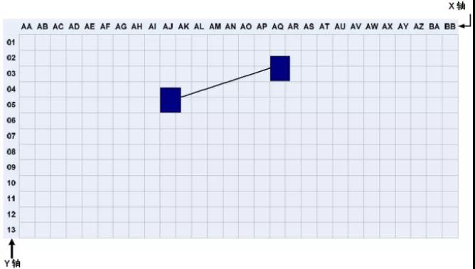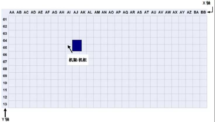 在數(shù)據(jù)中心,機(jī)柜和機(jī)架的位置和布局可以根據(jù)活動地板的劃分進(jìn)行組織和標(biāo)記。根據(jù)ANSI/TIA/EIA-606-A標(biāo)準(zhǔn),數(shù)據(jù)室應(yīng)使用兩個或兩個字母,每個600mm*600mm活動地板用阿拉伯?dāng)?shù)字標(biāo)識。在數(shù)據(jù)中心機(jī)房平面圖上建立X、Y坐標(biāo)系的網(wǎng)格,用字母標(biāo)記X軸,用數(shù)字標(biāo)記Y軸,建立坐標(biāo)原點。機(jī)架和機(jī)柜的位置基于它們在網(wǎng)格地圖上的正面坐標(biāo)。標(biāo)注如下圖 2所示