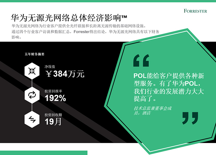 2022年上半年,華為委托權(quán)威咨詢公司Forrester進(jìn)行了《華為無源光網(wǎng)絡(luò)總體經(jīng)濟影響™》研究。在本研究中,F(xiàn)orrester通過客戶訪談,以專有方法論分析部署華為無源光網(wǎng)絡(luò)(Passive optical LAN,POL)方案對企業(yè)帶來的經(jīng)濟影響。研究結(jié)果顯示,企業(yè)使用華為POL五年投資回報率達(dá)192%,投資回報周期為19個月。