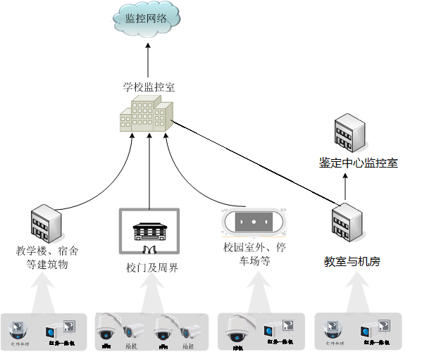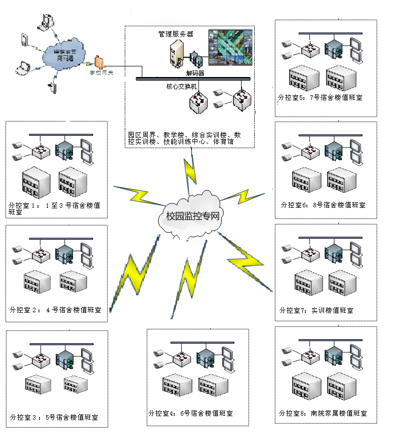 (1)分校區(qū)現(xiàn)有的監(jiān)控點(diǎn)遍布學(xué)校各個(gè)重要點(diǎn)位,包括教學(xué)樓、一體化樓、實(shí)訓(xùn)樓、辦公樓、學(xué)生宿舍、學(xué)生食堂、校內(nèi)重要場(chǎng)所等。通過光纖鏈路將前端各個(gè)點(diǎn)位匯聚到監(jiān)控中心,并統(tǒng)一傳到監(jiān)控中心集中存儲(chǔ)。