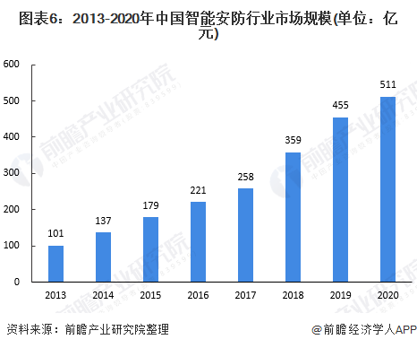 根據(jù)中安網(wǎng)《2020年中國安防行業(yè)調(diào)查報(bào)告》,2020年我國安防行業(yè)總產(chǎn)值為8510億元(其中安防產(chǎn)品總產(chǎn)值約為2600億元),根據(jù)2020年我國智能安防滲透率為6%測(cè)算,2020年我國智能安防市場規(guī)模約為511億元,2013-2020年市場規(guī)模年復(fù)合增長率達(dá)26%。