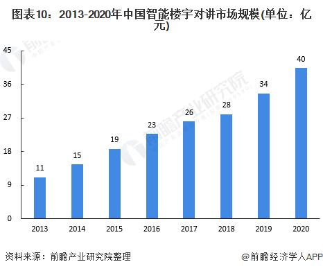 近年來,隨著居民生活水平的提高,居民住宅小區(qū)的管理越來越規(guī)范和嚴(yán)謹(jǐn),居民對(duì)于樓宇對(duì)講系統(tǒng)的性能要求有所提升,不再局限于簡單的語音對(duì)講,而逐年向網(wǎng)絡(luò)化、可視化化發(fā)展。數(shù)據(jù)顯示,隨著樓宇對(duì)講系統(tǒng)的不斷升級(jí),樓宇對(duì)講智能化滲透率不斷提高,目前滲透率在20%左右。2019年中國樓宇對(duì)講系統(tǒng)市場規(guī)模為154億元,由此得出2019年中國智能樓宇對(duì)講市場規(guī)模約為34億元,2013-2019年復(fù)合增長率為20%。據(jù)估算,2020年市場規(guī)模約為40億元左右。