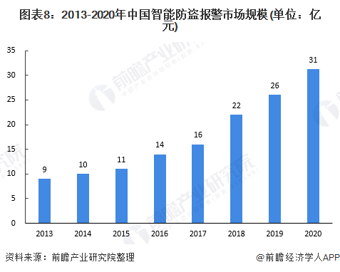 據(jù)中安網(wǎng)數(shù)據(jù)顯示,2020年我國安防行業(yè)總產(chǎn)值8510億元,其中安防產(chǎn)品總產(chǎn)值約為2600億元,結(jié)合防盜報(bào)警系統(tǒng)產(chǎn)值占安防產(chǎn)品總產(chǎn)值12%左右,根據(jù)我國智能防盜報(bào)警系統(tǒng)滲透率在10%左右測(cè)算,得出2020年我國智能防盜報(bào)警系統(tǒng)產(chǎn)值約為31億元。